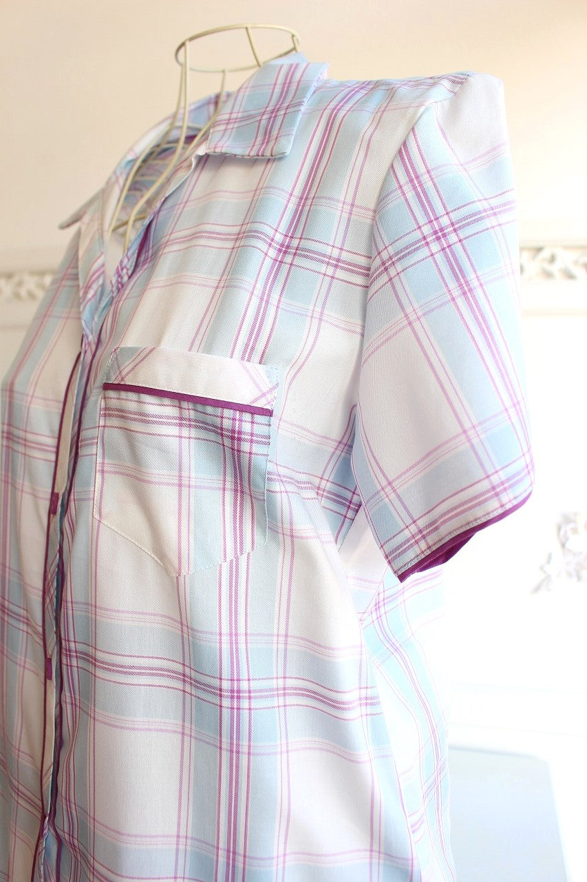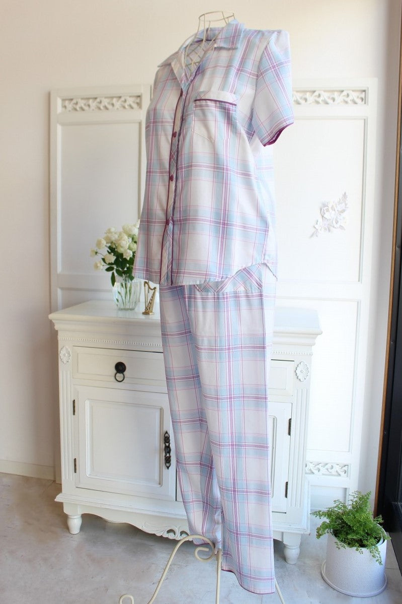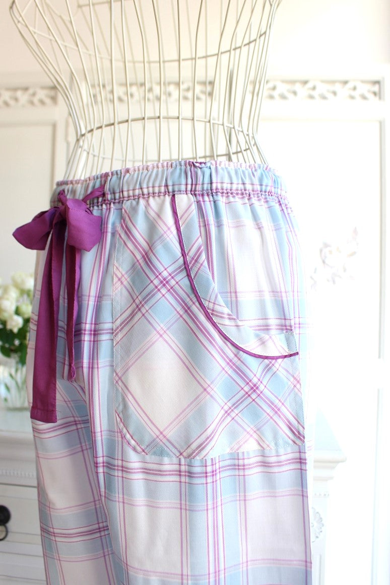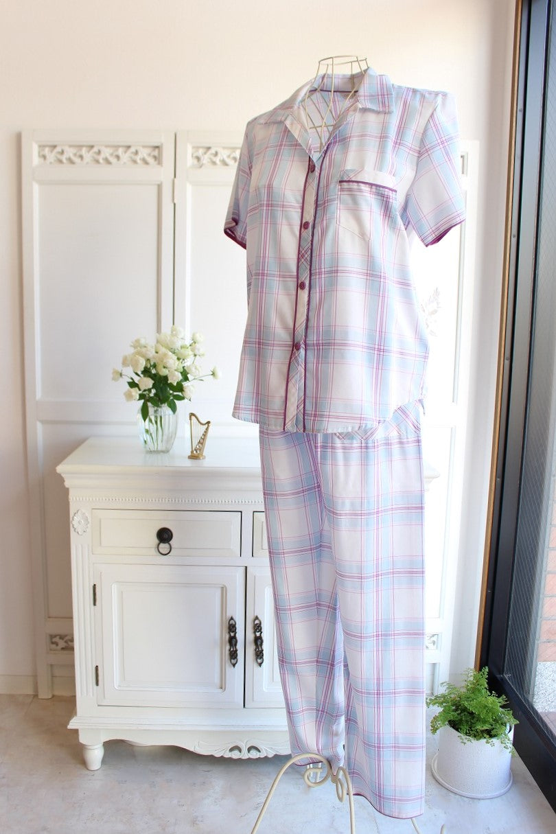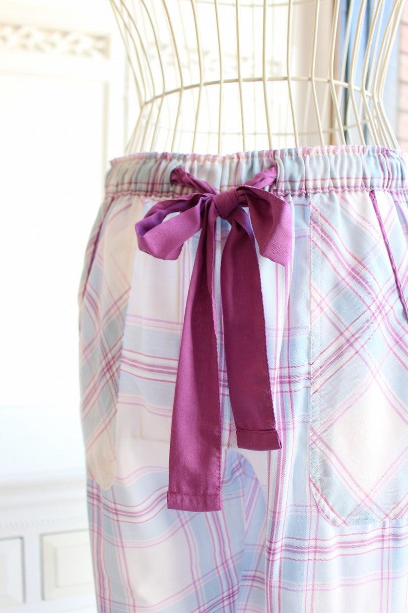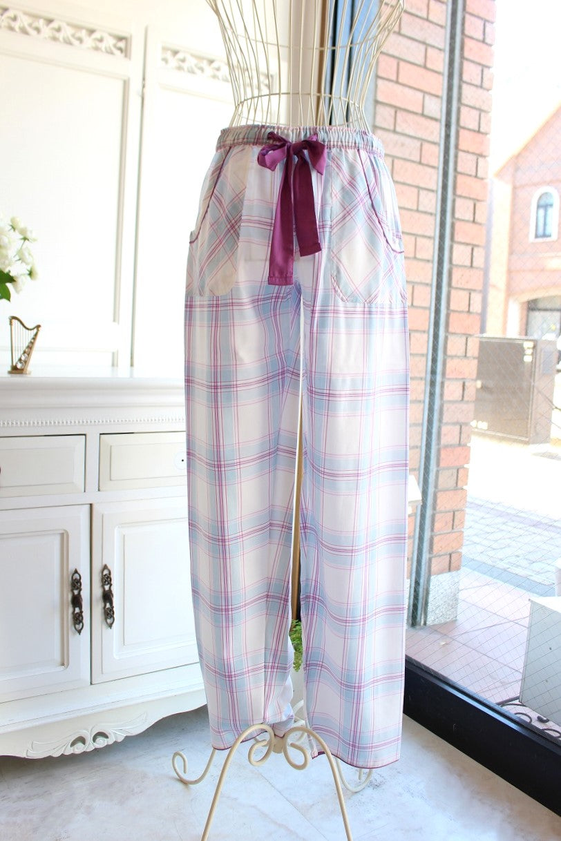パープルのパイピング、ボタン、パンツのリボンがポイントです。