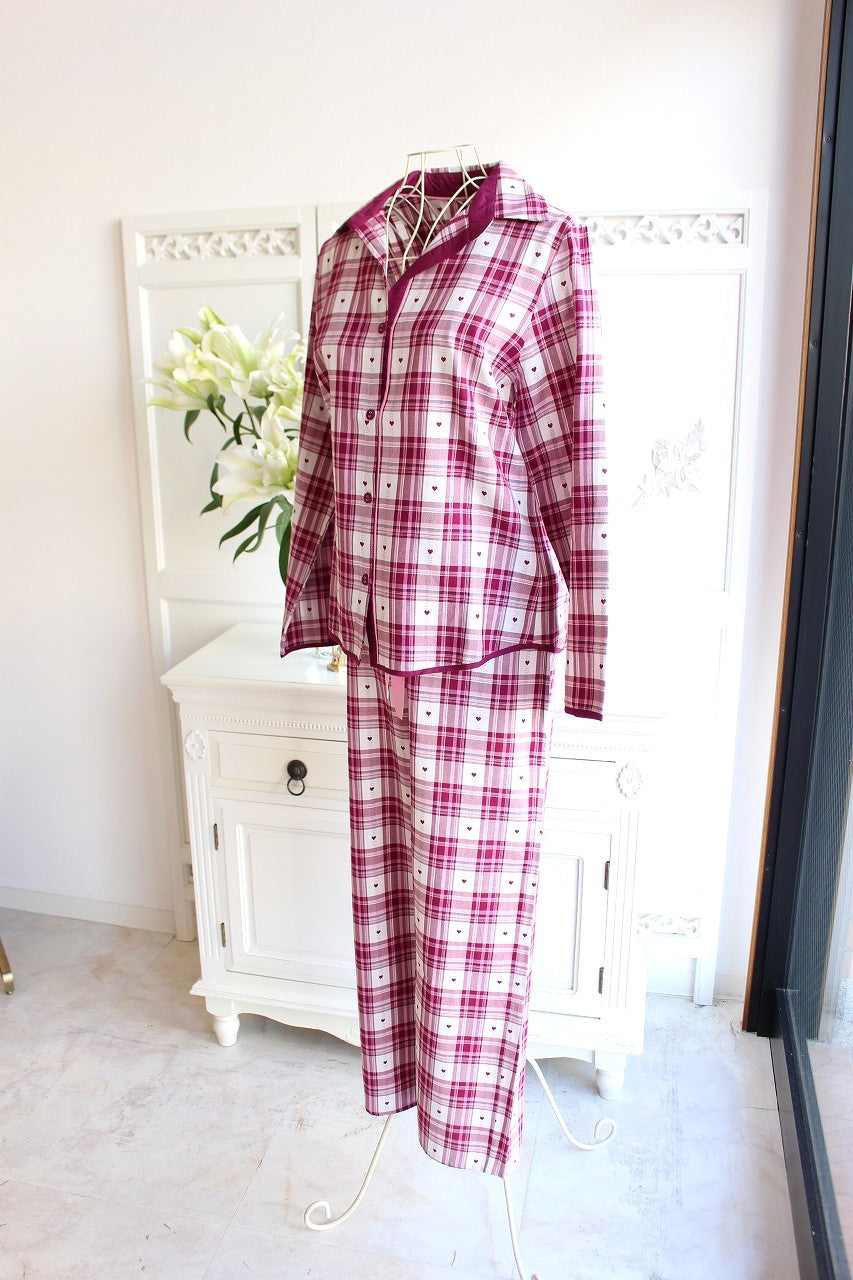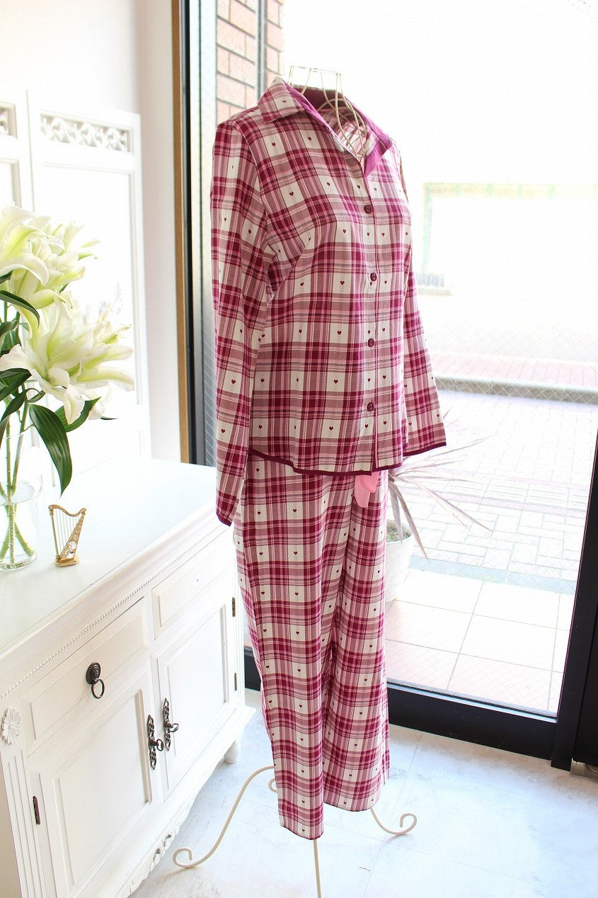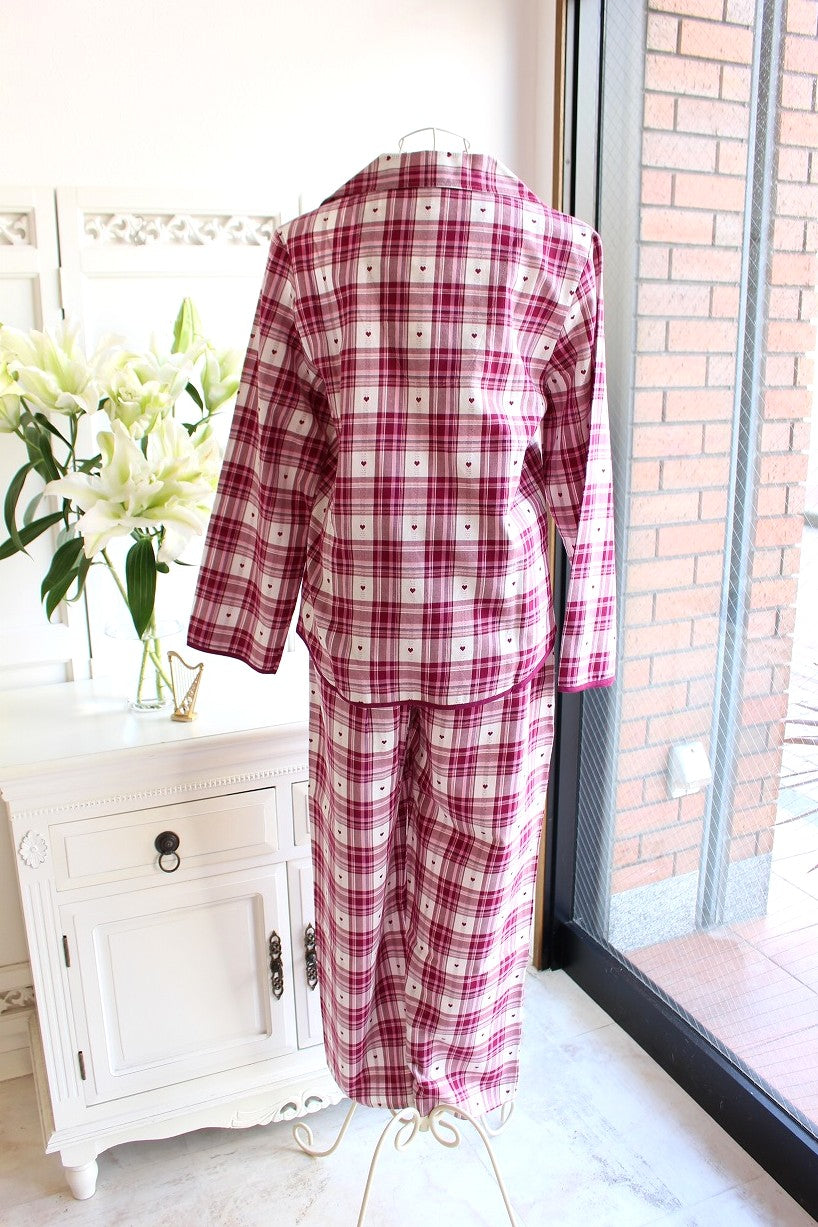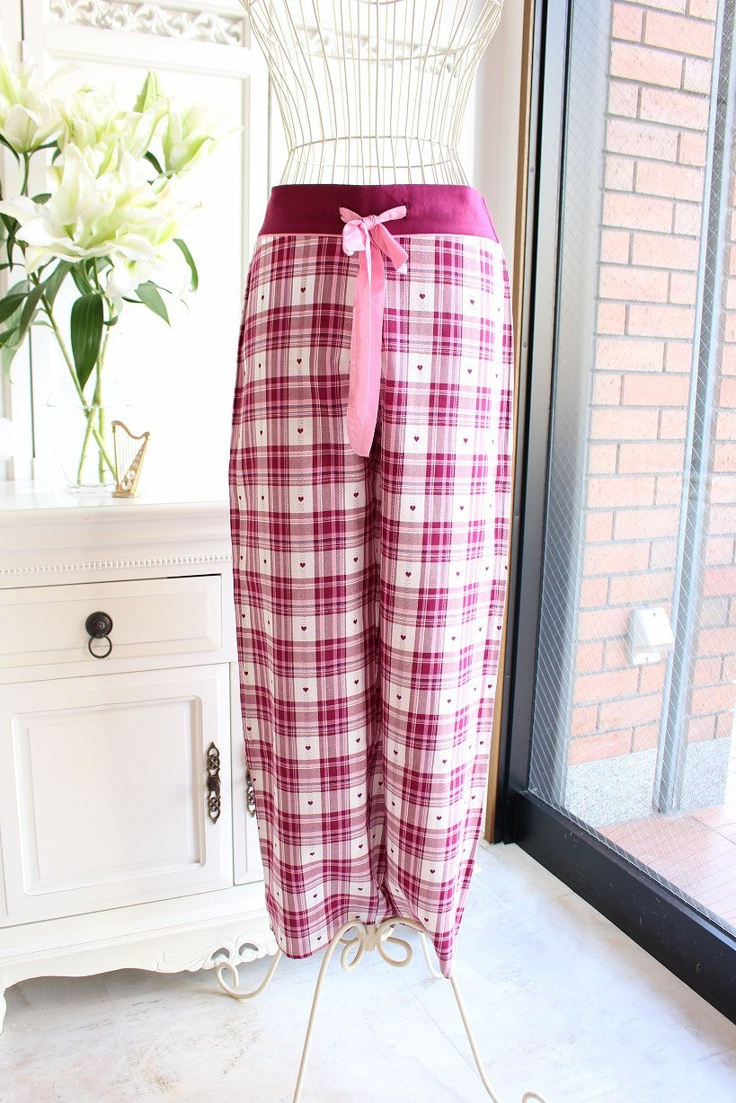 バーガンディのチェック柄にハートがあしらわれたポップなデザイン。