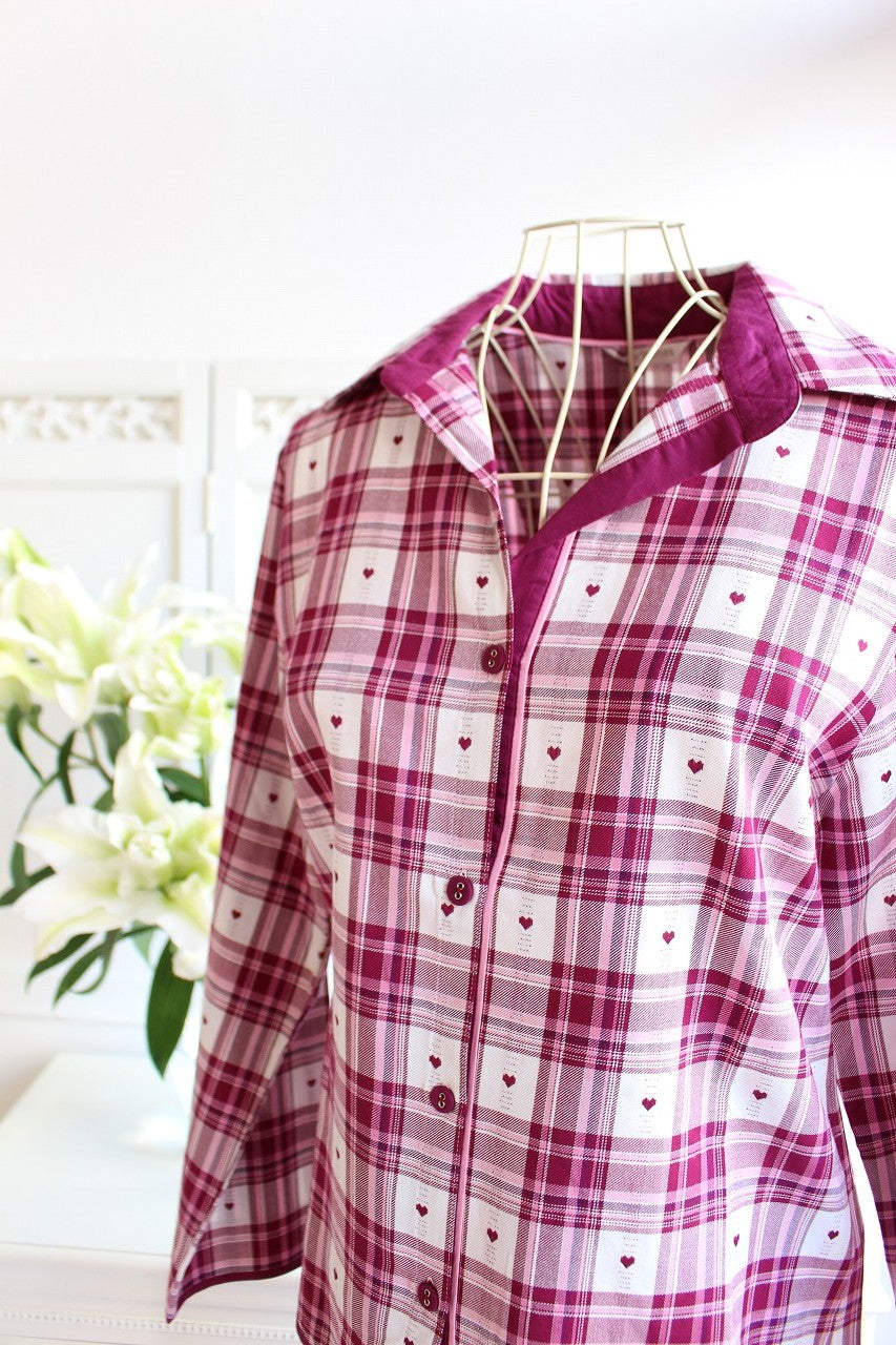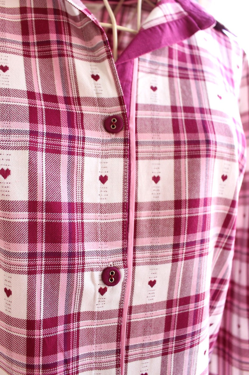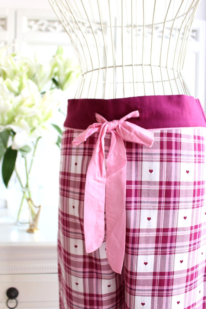 バーガンディのチェック柄にハートがあしらわれたポップなデザイン。